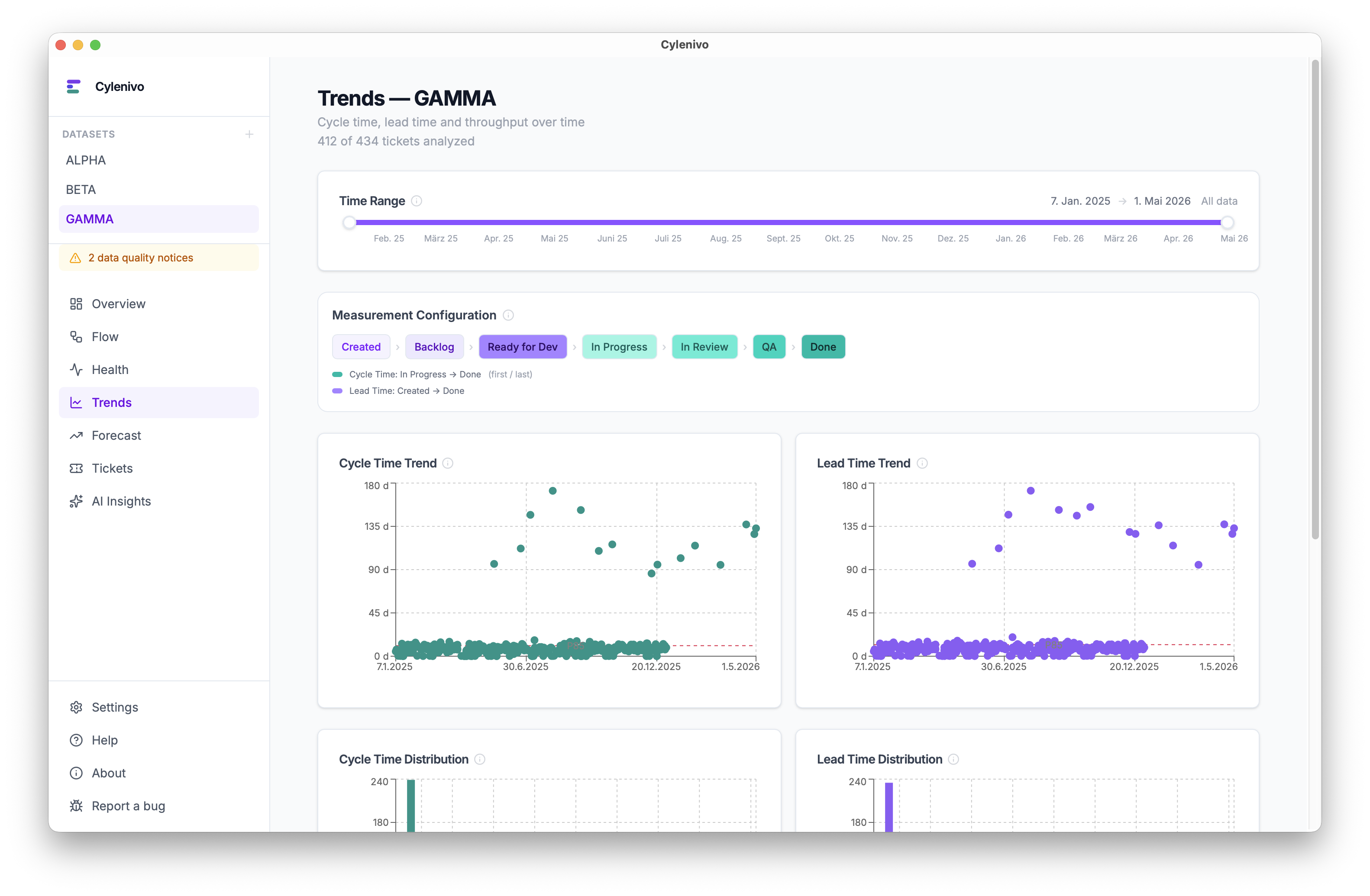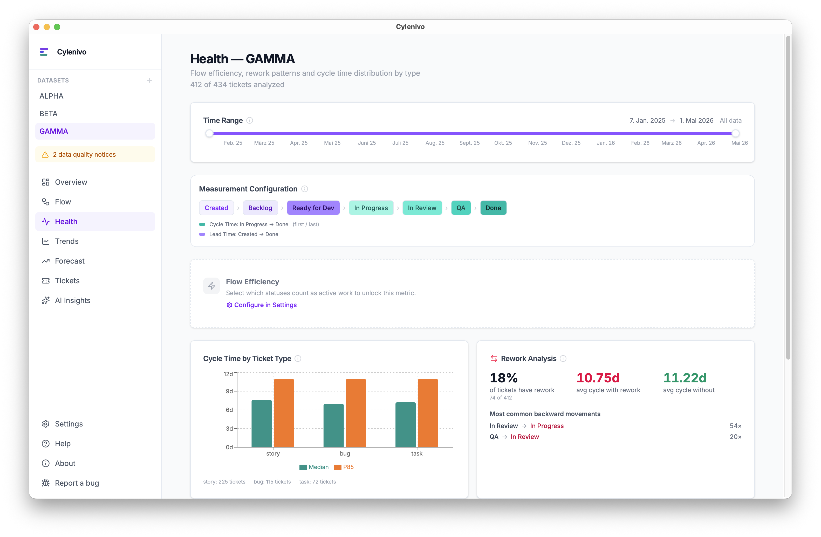 Cylenivo ist eine kleine kostenlose Desktop-App (Windows, Mac und Linux), die Cycle Time, Lead Time, Throughput, Time in Status und Rework aus deinen Ticketdaten rechnet. Dabei holt sie sich die Daten aus Jira oder via Plugins aus Trello oder OpenProject und verarbeite sie lokal.